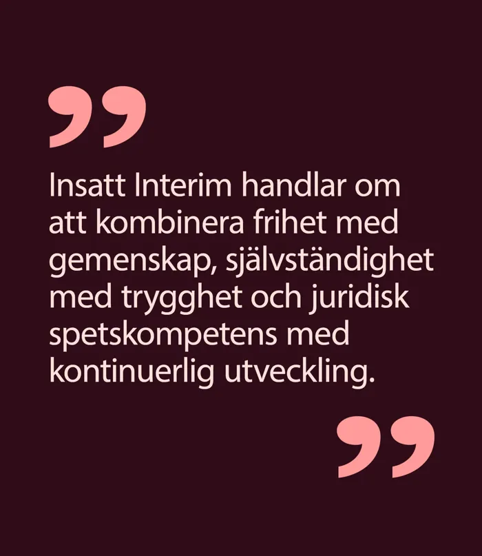 Insatt Interim handlar om att kombinera frihet med gemenskap, självständighet med trygghet och juridisk spetskompetens med kontinuerlig utveckling. I praktiken betyder det att våra kunder får mer än en interimslösning. De får tillgång till en samlad juridisk kompetens. Det minskar sårbarheten, ökar kvaliteten i besluten och ger trygghet även i komplexa situationer.