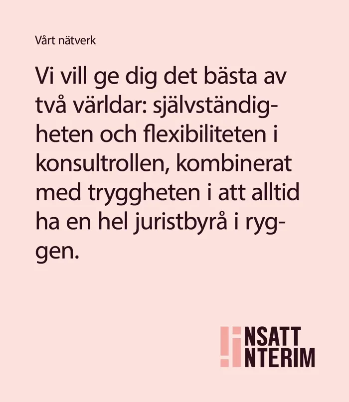 Att arbeta som interimskonsult behöver inte vara ensamt. Jag har själv sett hur många seniora jurister uppskattar friheten i ett konsultuppdrag men samtidigt saknar ett sammanhang där man kan bolla frågor, få stöd och utvecklas tillsammans med andra. För oss på Insatt Interim ligger därför en stor tyngdpunkt vid nätverket.